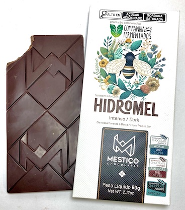 Now let me introduce you to Mestico’s Hidromel 77% Intense Dark chocolate bar. As mentioned, the cacao is single origin from Bonanca Farm in Brazil. Besides using their own pressed cocoa butter, they also use a honey-infusing fermentation process for the cacao. The process begins with fresh cacao fruits, which are opened and combined with water and honey in a fermentation tank. The beans undergo a two-month fermentation in the honey and water solution. Then the cacao continues with the regular process of being dried, roasted, and processed into chocolate.